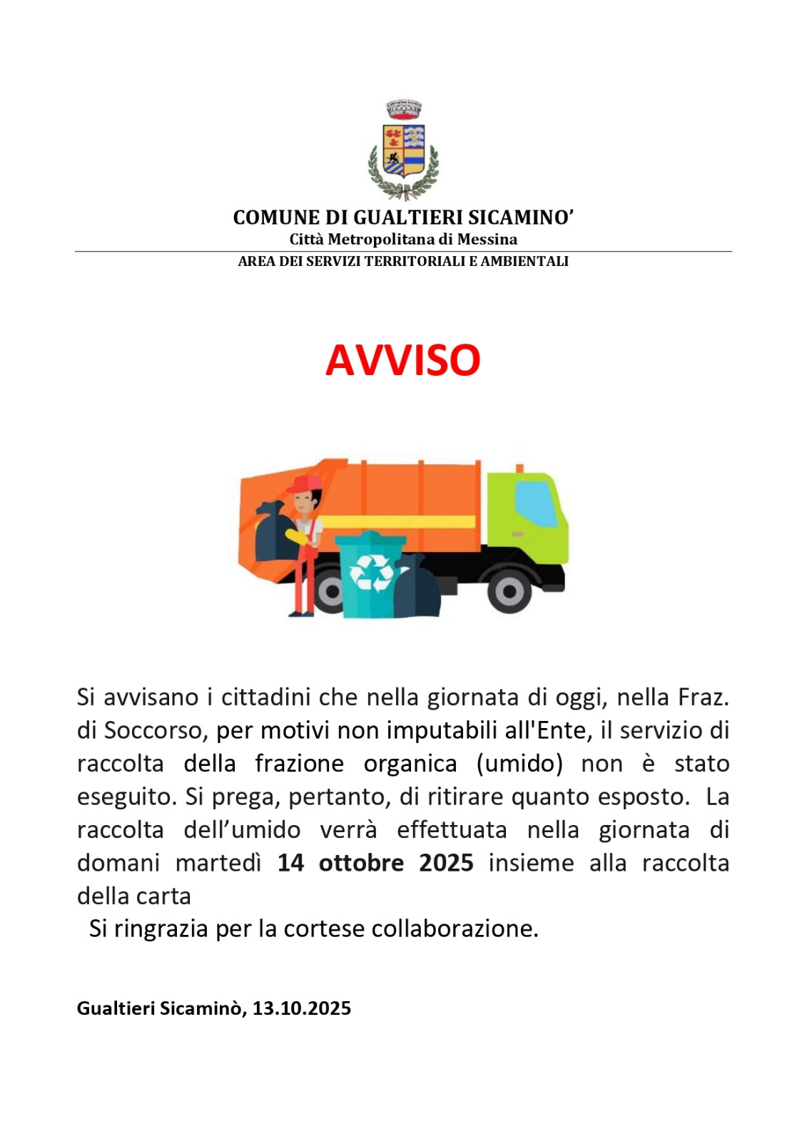 Si avvisano i cittadini che nella giornata di oggi, nella Fraz. di Soccorso, per motivi non imputabili all'Ente, il servizio di raccolta della frazione organica (umido) non è stato eseguito. Si prega, pertanto, di ritirare quanto esposto. La raccolta dell’umido verrà effettuata nella giornata di domani martedì 14 ottobre 2025 insieme alla raccolta della carta