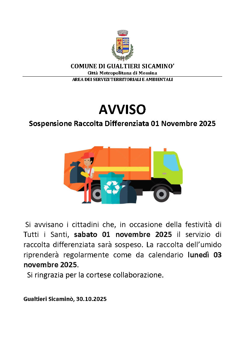 AVVISO Sospensione Raccolta Differenziata 01 Novembre 2025